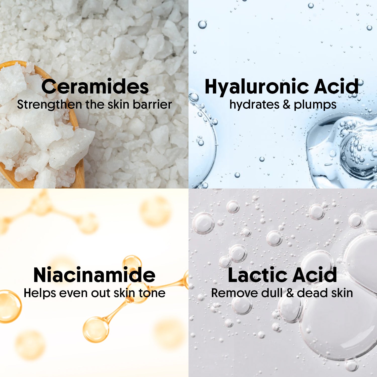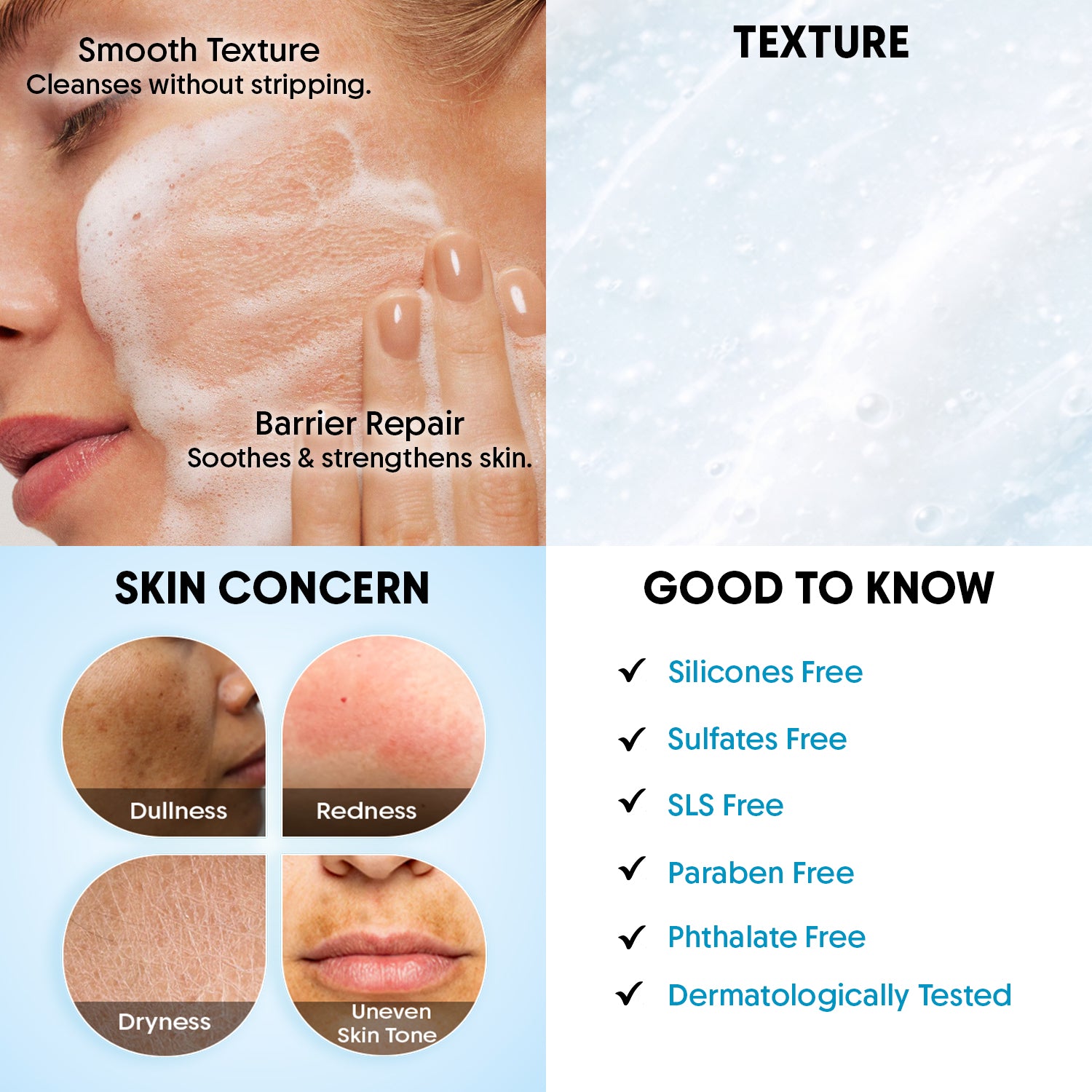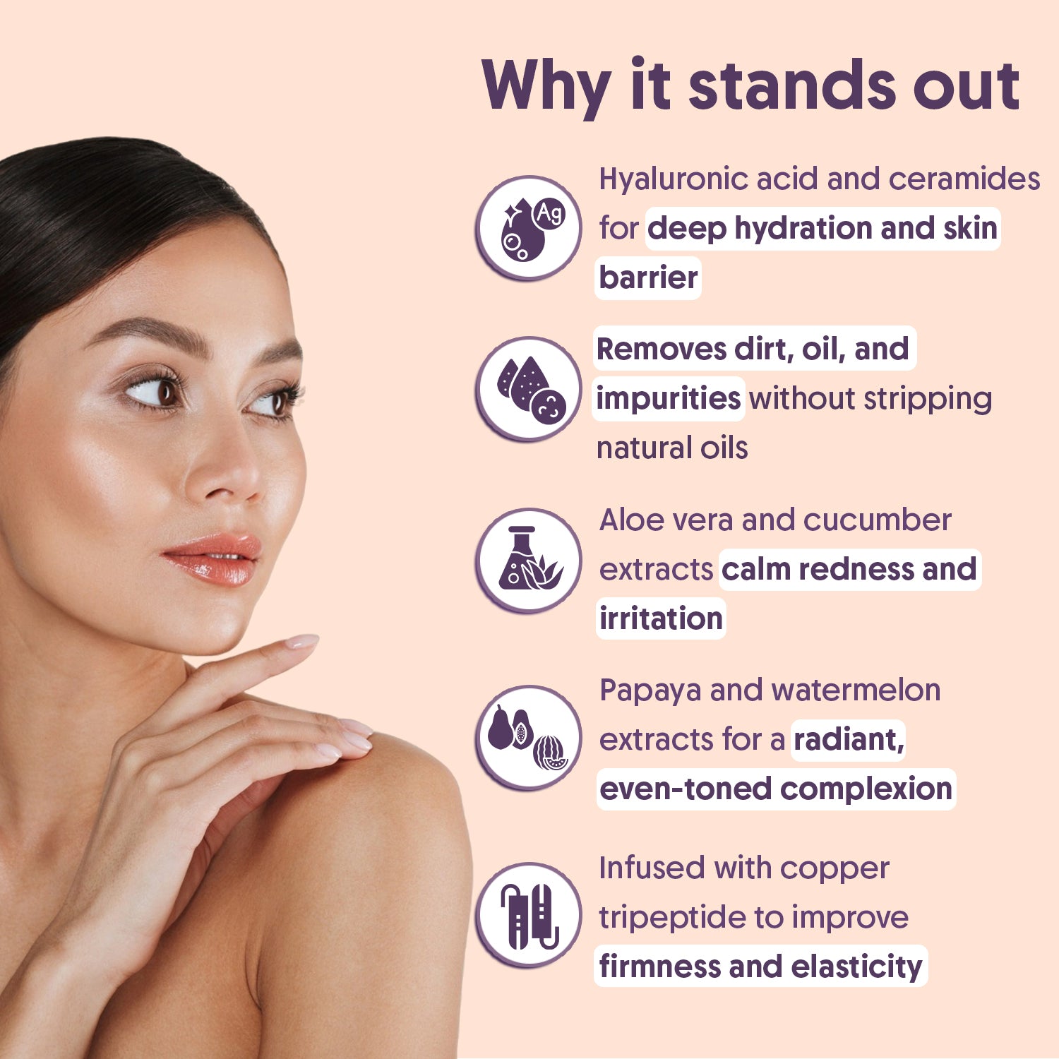 Code: COMBO25Aqua, Disodium EDTA, Sodium Cocoyl Isethionate, Sodium Methyl Cocoyl Turate, Decyl Glucoside, Sodium Cocoyl Glycinate, Peg-7 Glyceryl Cocoate, Cocamidopropyl Betaine, Niacinamide (Vitamin B3), Hyaluronic Acid, Ceramide-1, Ceramide-2, Ceramide-3, Ceramide-6, Copper Tripeptide, Acrylate Copolymer, Ethylene Glycol Distearete, Olive Oil, Propandiol, Glycerin (and) Glyceryl Glucoside (Aquaporine), Aloe Vera Extract, Cucumis Sativus Extract, Carica Papaya Extract, Citrullus Lanatus Extract, Lactic Acid, Phenoxyethanol, IFRA Certified Allergen Free Fragrance.